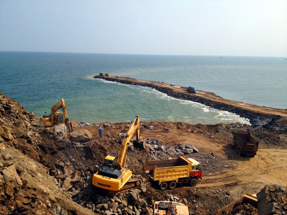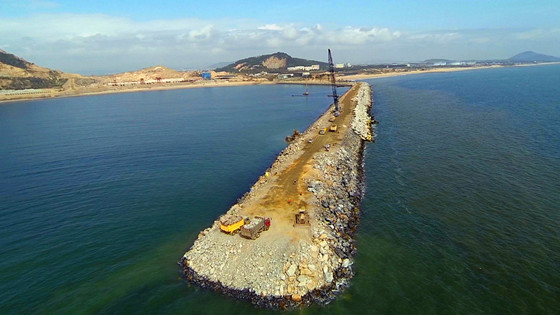 博賀新港區(qū)西防波堤建設(shè)現(xiàn)場(chǎng)