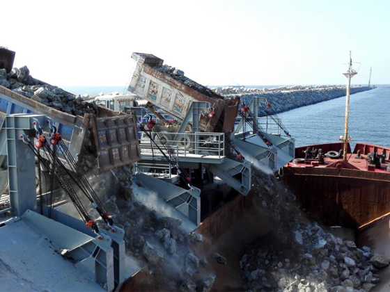 為突破施工進(jìn)度瓶頸,進(jìn)一步加快防波堤建設(shè)進(jìn)度,茂名港開發(fā)建設(shè)公司聯(lián)合施工單位、監(jiān)理單位,經(jīng)過周密論證,決定建設(shè)臨時(shí)出運(yùn)碼頭,開展水上船運(yùn)拋填作業(yè),與陸上車運(yùn)拋填齊頭并進(jìn)。東防波堤臨時(shí)出運(yùn)碼頭于今年6月份動(dòng)工建設(shè),經(jīng)過全體工程人員的不懈努力,該碼頭于9月24日建成投入使用。該碼頭為重力式碼頭結(jié)構(gòu),港池標(biāo)高為-4.3m,可滿足一艘1000立方米的開底駁船靠泊,作業(yè)平臺前設(shè)置了4個(gè)鋼結(jié)構(gòu)卸料槽,可容納4輛運(yùn)載能力20立方米的貨車同時(shí)卸石料裝船。