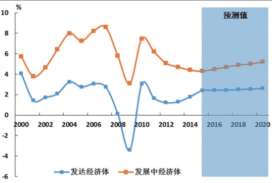 圖1 世界經(jīng)濟增速 發(fā)展中經(jīng)濟體地位繼續(xù)提升,經(jīng)濟增長的引擎回歸發(fā)達(dá)經(jīng)濟體。2000-2007年發(fā)展中經(jīng)濟體年均增速為6.7%,高于世界平均增速2.3個百分點。受到金融危機沖擊,發(fā)達(dá)經(jīng)濟體出現(xiàn)大幅度的下滑(如圖2所示),歐美日經(jīng)濟同時面臨巨大沖擊甚至出現(xiàn)萎縮,發(fā)展中經(jīng)濟體雖然經(jīng)濟增速有所下降,但明顯好于發(fā)達(dá)經(jīng)濟體,發(fā)展中經(jīng)濟體特別是中國一度扮演了世界經(jīng)濟增長引擎的角色。依托技術(shù)優(yōu)勢,發(fā)達(dá)經(jīng)濟體增速呈現(xiàn)回升態(tài)勢,而發(fā)展中經(jīng)濟體增速將有所放緩,與世界經(jīng)濟平均增速差異明顯縮小到1.1個百分點。預(yù)計“十三五”期發(fā)達(dá)經(jīng)濟體的年均增速為2.5%,發(fā)展中經(jīng)濟體為4.9%(如圖2所示)。按照對世界經(jīng)濟增長的絕對凈貢獻(xiàn)來計算,經(jīng)濟增長引擎開始回歸到發(fā)達(dá)經(jīng)濟體,這意味著相對于集裝箱而言,大宗貨物海運需求減緩將更加明顯。