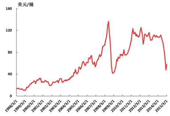 圖2 發(fā)達(dá)經(jīng)濟體與發(fā)展中經(jīng)濟體增速 2. 資源類大宗商品供需關(guān)系轉(zhuǎn)換,商品價格相對低位。 大宗資源類價格進(jìn)入一輪低谷。在上一輪世界經(jīng)濟快速增長的帶動下,對石油、鐵礦石等資源類商品需求快速增長,天平向供給方傾斜,推動了資源價格大幅度上漲(如圖3和圖4所示),同時也刺激資本對資源開發(fā)、生產(chǎn)投入大幅度增長。在世界經(jīng)濟增速放緩、生產(chǎn)率效率持續(xù)提高和日益注重節(jié)能減排的背景下,需求減弱,而產(chǎn)出穩(wěn)定增長,供需關(guān)系出現(xiàn)了失衡,天平向需求方傾斜,資源價格開始大幅下跌。石油價格一度跌至40多美元,中國鐵礦石到岸價也跌至60-70美元的水平(如圖3和圖4所示)。從多個機構(gòu)的預(yù)測來看,今后一個時期大宗商品價格很難有大幅提升。