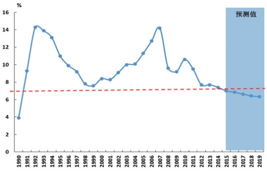 圖3 布倫特原油現(xiàn)貨價格 3. 技術(shù)孕育新突破,世界經(jīng)貿(mào)構(gòu)筑新格局。 自身發(fā)展規(guī)律和全球經(jīng)濟調(diào)整都揭示出未來將取得重大技術(shù)突破。從重大技術(shù)突破自身規(guī)律看,當(dāng)前正處于孕育期,盡管突破的核心技術(shù)難以預(yù)測,但可以看到信息化、能源和人工智能以及以美國為代表的生物醫(yī)藥技術(shù),都可以作為孕育突破的溫床。身邊就可以看到的是互聯(lián)網(wǎng)正逐步改變著企業(yè)經(jīng)營和人們的生活消費,突破了以往的商業(yè)模式。 技術(shù)經(jīng)濟對比變化和各國戰(zhàn)略調(diào)整,推動形成新的經(jīng)貿(mào)格局。為有效應(yīng)對經(jīng)濟發(fā)展和全球氣候變化面臨的新問題,發(fā)達(dá)國家依托技術(shù)優(yōu)勢,促使經(jīng)濟逐步復(fù)蘇,并成為世界經(jīng)濟增長的主要動力。美國重振制造業(yè)和德國工業(yè)4.0代表著西方國家的制造業(yè)開始重新展現(xiàn)出新的活力,成為經(jīng)濟復(fù)蘇的重要動力,同時以歐盟為代表的發(fā)達(dá)國家依托節(jié)能減排技術(shù)優(yōu)勢,大力推動低碳發(fā)展和碳交易,也在重塑世界制造業(yè)貿(mào)易格局,帶動發(fā)達(dá)國家重回世界引擎地位。發(fā)展中實體之間經(jīng)濟增長也開始出現(xiàn)差異,金磚國家之間分化明顯,預(yù)計“十三五”期印度經(jīng)濟年均增速約為6.5%,而巴西、俄羅斯分別降為2.7%和1.8%。世界經(jīng)濟力量、技術(shù)力量對比的變化,加之地緣政治和各國戰(zhàn)略的調(diào)整,正在推動全球形成新的經(jīng)貿(mào)格局,為適應(yīng)這種變化,美國通過主導(dǎo)的TPP、TTIP意在構(gòu)筑國際貿(mào)易的新規(guī)則 TPP,與此相對應(yīng),我國也通過全面推進(jìn)自由貿(mào)易區(qū)和“一帶一路”戰(zhàn)略,來適應(yīng)國際形勢變化,調(diào)整國家戰(zhàn)略。 “十三五”我國經(jīng)貿(mào)發(fā)展特點 1.我國經(jīng)濟轉(zhuǎn)向中速增長階段,經(jīng)濟結(jié)構(gòu)發(fā)生轉(zhuǎn)折性變化。 經(jīng)濟進(jìn)入中速增長階段。圖5顯示了1990年以來我國經(jīng)濟增速的變化。2000-2010年我國經(jīng)濟、對外貿(mào)易分別保持了年均10.5%和20.2%的增長,2010年后呈現(xiàn)逐步放緩態(tài)勢,2014年降為7.4%。當(dāng)前,我國經(jīng)貿(mào)發(fā)展面臨十分復(fù)雜的國際環(huán)境,內(nèi)部則處于“三期”疊加期。隨著新型工業(yè)化、信息化、農(nóng)業(yè)現(xiàn)代化和城鎮(zhèn)化“新四化”的不斷推進(jìn),以及市場機遇、投資機遇、綠色機遇和對外合作機遇的不斷擴大,為我國經(jīng)濟增長提供了巨大潛力和回旋空間。這些發(fā)展環(huán)境變化使我國經(jīng)濟發(fā)展進(jìn)入新常態(tài),預(yù)計2015年GDP增長約7%,“十三五”期間經(jīng)濟平均增速只要保持在6.6%(如圖5所示),即可實現(xiàn) 2020年GDP總量比2010年翻一番的戰(zhàn)略目標(biāo),按照人均GDP水平測算,我國將進(jìn)入高收入國家行列,對海運需求質(zhì)量將全面提高。