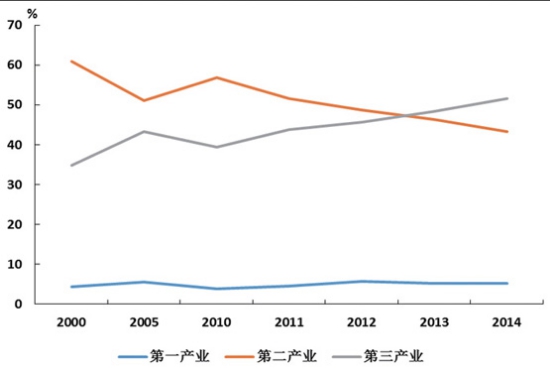 圖5 我國GDP增速變化 產(chǎn)業(yè)與區(qū)域經(jīng)濟結(jié)構(gòu)調(diào)整,第三產(chǎn)業(yè)成為經(jīng)濟增長的主要動力。隨著經(jīng)濟社會的進(jìn)步,經(jīng)濟結(jié)構(gòu)不斷優(yōu)化,第三產(chǎn)業(yè)所占比重逐步提高,并于2013年首次超過第二產(chǎn)業(yè)(如圖6所示)。未來,經(jīng)濟將進(jìn)入中速增長階段,而第三產(chǎn)業(yè)可望保持相對較快的增長,占GDP比重持續(xù)提高,結(jié)構(gòu)不斷優(yōu)化。從三駕馬車的貢獻(xiàn)來看,外貿(mào)和投資的作用逐漸減弱,經(jīng)濟增長主要依托消費的增長。消費的增長并不能像第二產(chǎn)業(yè)那樣直接拉動運輸需求量的增長,這一態(tài)勢使得運輸需求對GDP增速彈性減弱。 經(jīng)濟增速整體放緩與個別產(chǎn)業(yè)快速增長并存。從產(chǎn)業(yè)發(fā)展角度來看,無論是從國家深化改革,還是實體經(jīng)濟發(fā)展,要素資本的作用正逐步減小,制度資本的作用開始顯現(xiàn),創(chuàng)新發(fā)展開始優(yōu)于要素的投入,表現(xiàn)為在我國經(jīng)濟增速整體放緩的背景下,各產(chǎn)業(yè)之間開始呈現(xiàn)明顯分化,如電商業(yè)務(wù)、快遞業(yè)務(wù)等開始出現(xiàn)爆發(fā)式的增長。從企業(yè)效益看,近年來,盡管我國企業(yè)整體的回報在下降,但是少數(shù)產(chǎn)業(yè)回報依然保持較高水平。