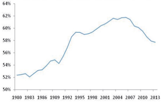 圖6 三大產(chǎn)業(yè)占規(guī)模經(jīng)濟比重變化 區(qū)域協(xié)調(diào)發(fā)展,沿海地區(qū)占經(jīng)濟比重下降。隨著西部開發(fā)、中部崛起戰(zhàn)略的實施,中西部地區(qū)逐步扭轉(zhuǎn)了經(jīng)濟增速長期低于沿海地區(qū)的態(tài)勢,2004年后在經(jīng)濟總量中所占比重逐步上升。根據(jù)國家全面建成小康社會目標(biāo),在長江經(jīng)濟帶、“一帶一路”和京津冀協(xié)同發(fā)展國家戰(zhàn)略的推動下,東部沿海經(jīng)濟最發(fā)達(dá)地區(qū)將保持穩(wěn)定增長,但所占GDP比重呈現(xiàn)下降態(tài)勢(如圖7所示),各區(qū)域間的經(jīng)濟發(fā)展水平在趨于均衡。