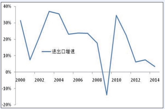 圖7 沿海地區(qū)(含北京)占全國GDP比重 2.對外貿(mào)易彈性下降,貿(mào)易伙伴多元化。 外貿(mào)保持穩(wěn)定增長,與經(jīng)濟彈性進(jìn)一步下降。在加入WTO的帶動下,2000-2007年我國外貿(mào)進(jìn)出口總額保持了24.3%的年均增長(如圖8所示),與 GDP的彈性系數(shù)高達(dá)2.25,明顯高出世界1.5的平均水平,成為世界重要經(jīng)貿(mào)大國。受到金融危機沖擊和全球貿(mào)易放緩的影響,面對國內(nèi)外復(fù)雜形勢,2007-2014年我國對外貿(mào)易仍保持較快發(fā)展,外貿(mào)進(jìn)出口總額年均增速達(dá)到10.2%,國際貿(mào)易地位不斷提高,成為世界第一貨物貿(mào)易大國。隨著貿(mào)易依賴度的提高,進(jìn)出口彈性逐步下降,由2.25下降為1.16!笆濉逼陂g我國對外貿(mào)易發(fā)展將面臨更加復(fù)雜的國際環(huán)境,將逐步轉(zhuǎn)入平穩(wěn)發(fā)展階段,與 GDP的彈性下降為1.0,外貿(mào)進(jìn)出口總額增速保持在6.6%與GDP相當(dāng)?shù)乃健?BR> 貿(mào)易區(qū)域結(jié)構(gòu)不斷優(yōu)化,貿(mào)易伙伴保持多元化趨勢。隨著我國經(jīng)濟社會發(fā)展水平的提高,貿(mào)易呈現(xiàn)多元化發(fā)展趨勢,特別是金融危機后,亞洲、歐洲和北美洲占貿(mào)易比重由2007年的89.6%逐步降為2014年的85.1%,美國、歐盟和日本所占比重由41.1%降為34.4%,而非洲、拉丁美洲所占貿(mào)易比重則由 8.1%上升為11.3%。隨著世界貿(mào)易格局的調(diào)整,以及我國“一帶一路”戰(zhàn)略的推進(jìn),對外貿(mào)易結(jié)構(gòu)將進(jìn)一步優(yōu)化,與東盟、非洲等海上絲綢之路沿線國家貿(mào)易比重進(jìn)一步上升。