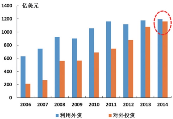 圖8 我國外貿(mào)進(jìn)出口總額增速變化 3.對外投資快速增長,“引進(jìn)來”與“走出去”并重。 我國將實現(xiàn)由利用外資為主逐步轉(zhuǎn)向利用外資與對外投資并重得格局轉(zhuǎn)換。改革開放初期,由于經(jīng)濟社會發(fā)展水平較低,發(fā)展面臨資金短缺的壓力,形成了我國以引進(jìn)外資為主的格局。隨著我國經(jīng)濟發(fā)展、進(jìn)入中高收入國家行列和成為世界外匯儲備最多的國家,在繼續(xù)注重利用外資的同時,也逐步擴大對外投資,對外投資流量已居世界第三,吸引外資和對外投資都達(dá)到1000億美元規(guī)模,兩者基本均衡(如圖9所示)。從我國“走出去”的重點行業(yè)來看,主要集中于采礦業(yè)、制造業(yè)、服務(wù)業(yè)、高科技行業(yè)和優(yōu)勢農(nóng)業(yè)。預(yù)計“十三五”期間對外投資將保持1000億美元,“走出去”發(fā)展將使我國海運需求由原來的放射結(jié)構(gòu),轉(zhuǎn)向全球網(wǎng)絡(luò)化結(jié)構(gòu);同時針對“走出去”面臨各種風(fēng)險,要求海運在應(yīng)對突發(fā)事件中更好地發(fā)揮支持保障作用。