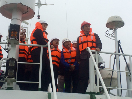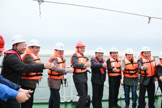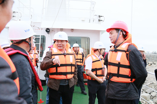 (市委書記、市人大常委會(huì)主任許光,市委副書記、市長李紅軍等同志登船遠(yuǎn)眺) 9時(shí)30分,“我宣布,茂名博賀新港區(qū)東防波堤陸上、西防波堤水下正式合龍!”許光宣布博賀新港區(qū)東防波堤合龍施工成功實(shí)施。隨即,堤上的施工人員立即行動(dòng)起來,發(fā)動(dòng)推土機(jī)、鉤機(jī)等施工作業(yè)機(jī)器,對(duì)堤身石料進(jìn)行最后推填。 博賀新港區(qū)防波堤工程是博賀新港區(qū)的基石,是茂名濱海新區(qū)港、業(yè)、城“三位一體”發(fā)展戰(zhàn)略的啟動(dòng)工程,也是省重點(diǎn)建設(shè)項(xiàng)目。防波堤分東、西兩段,東西合璧,互為掩護(hù),不可分割,共同為博賀新港區(qū)形成一個(gè)有掩護(hù)的環(huán)抱式的風(fēng)平浪靜的現(xiàn)代化深水良港,并將為港區(qū)內(nèi)后續(xù)臨港產(chǎn)業(yè)項(xiàng)目建設(shè)、發(fā)展提供優(yōu)良條件。