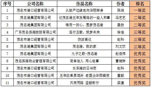 為紀(jì)念集團(tuán)成立5周年,集團(tuán)開展了系列紀(jì)念活動(dòng),其中宣傳欄和征文評(píng)比活動(dòng)已圓滿結(jié)束。下屬子公司用心制作了展板,回顧了五年來跋涉前行的足跡;以“茂名港,我的家”為主題,用文字展示集團(tuán)5年來的新成就、新形象和集團(tuán)員工的新生活、新風(fēng)采。經(jīng)多輪投票和評(píng)審,現(xiàn)將作品獲獎(jiǎng)情況予以公示。