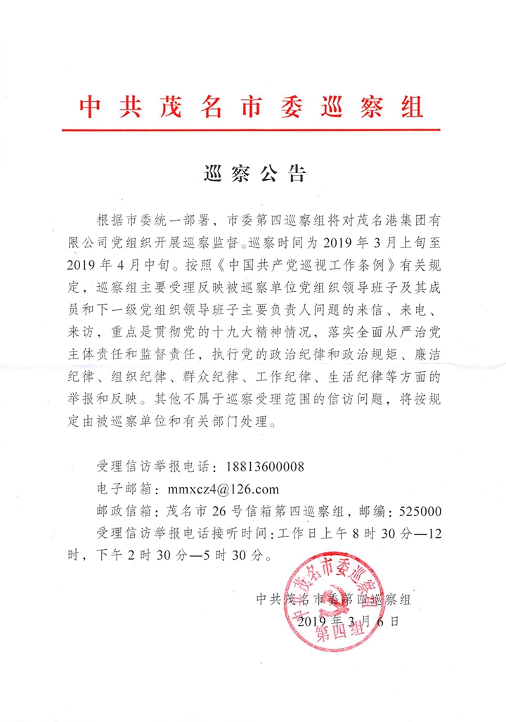 3月6日上午,根據(jù)市委統(tǒng)一部署,市委第四巡察組進(jìn)駐茂名港集團(tuán)開展巡察工作,并召開了巡察工作動(dòng)員會(huì)。會(huì)上,市委第四巡察組長(zhǎng)呂國(guó)海作動(dòng)員講話,集團(tuán)黨委書記、董事長(zhǎng)劉乃英作表態(tài)發(fā)言,會(huì)議按照巡察工作流程進(jìn)行了民主測(cè)評(píng)。集團(tuán)黨委領(lǐng)導(dǎo)班子、集團(tuán)機(jī)關(guān)全體干部和下屬子公司班子成員參加了本次動(dòng)員會(huì)。 呂國(guó)海指出,巡察工作是嚴(yán)肅黨內(nèi)政治生活、加強(qiáng)黨內(nèi)監(jiān)督、深入推進(jìn)全面從嚴(yán)治黨的一項(xiàng)重大舉措。此次巡察突出政治巡察,深入監(jiān)督檢查加強(qiáng)黨的領(lǐng)導(dǎo)、推進(jìn)黨的建設(shè)、全面從嚴(yán)治黨、嚴(yán)肅黨內(nèi)政治生活、執(zhí)行黨的路線方針政策等方面的情況。茂名港集團(tuán)要深刻認(rèn)識(shí)開展巡察工作的重要性和緊迫性,全體黨員干部要切實(shí)提高政治站位,把握巡察監(jiān)督的實(shí)質(zhì),端正思想認(rèn)識(shí),以高度的政治責(zé)任感和求真務(wù)實(shí)的作風(fēng),全力擁護(hù)支持配合巡察組工作。茂名港集團(tuán)領(lǐng)導(dǎo)班子及成員要把自己擺進(jìn)去,加強(qiáng)組織協(xié)調(diào),主動(dòng)配合巡察組開展工作,要敢于直面問題,勇于自我剖析,切實(shí)增強(qiáng)接受監(jiān)督的自覺性,確保巡察工作取得實(shí)效。 呂國(guó)海強(qiáng)調(diào),做好此次巡察工作,是市委第四巡察組和茂名港集團(tuán)共同的政治責(zé)任。茂名港集團(tuán)要切實(shí)擔(dān)負(fù)起巡察整改的主體責(zé)任,按照市委要求及時(shí)公開整改情況,接受黨內(nèi)和社會(huì)監(jiān)督。 劉乃英對(duì)巡察組的到來表示熱烈的歡迎和衷心的感謝。他表示,這是茂名港集團(tuán)成立以來,市委對(duì)集團(tuán)的第一次巡察,充分體現(xiàn)了市委和市委巡察組對(duì)茂名港集團(tuán)工作的高度重視,對(duì)茂名港集團(tuán)黨員領(lǐng)導(dǎo)干部的關(guān)心愛護(hù)。他表示,將嚴(yán)格按照市委要求,提高政治站位,端正思想認(rèn)識(shí),嚴(yán)守紀(jì)律和規(guī)矩,主動(dòng)接受巡察組的檢查和人民群眾的監(jiān)督。積極配合并全力做好各方面的服務(wù)工作,努力為巡察組開展工作創(chuàng)造良好的環(huán)境。對(duì)巡察組反饋的問題和建議,立行立改,建章立制,抓住巡察工作的有利契機(jī),切實(shí)把巡察組各項(xiàng)工作要求轉(zhuǎn)化為加強(qiáng)和改進(jìn)工作的強(qiáng)大動(dòng)力,推動(dòng)茂名港集團(tuán)各項(xiàng)工作加快發(fā)展。 會(huì)議按照巡察工作流程進(jìn)行了民主測(cè)評(píng)。集團(tuán)黨委領(lǐng)導(dǎo)班子、集團(tuán)機(jī)關(guān)全體干部和下屬子公司班子成員參加了本次動(dòng)員會(huì)。