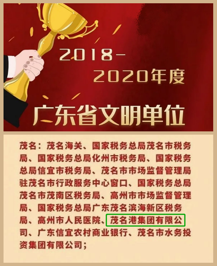 近日,廣東省精神文明建設(shè)表彰大會在廣州隆重舉行。作為成立僅八年多時(shí)間的市屬國有企業(yè),茂名港集團(tuán)榮獲廣東省2018-2020年度文明單位稱號。