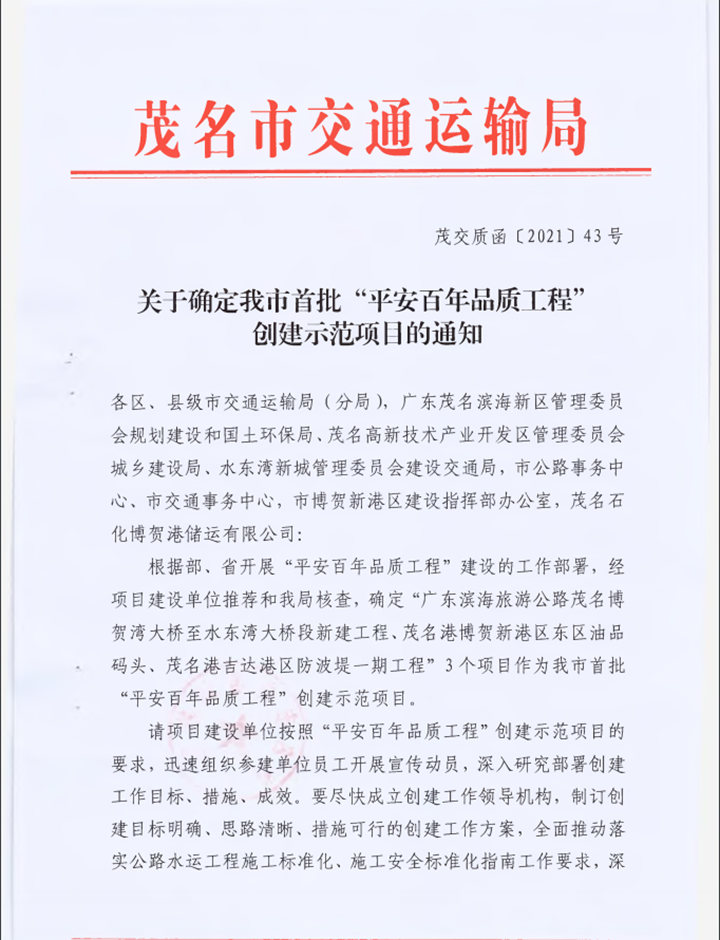 喜報!茂名港博賀新港區(qū)東區(qū)油品碼頭工程被確定為茂名市首批“平安百年品質(zhì)工程”創(chuàng)建示范項目