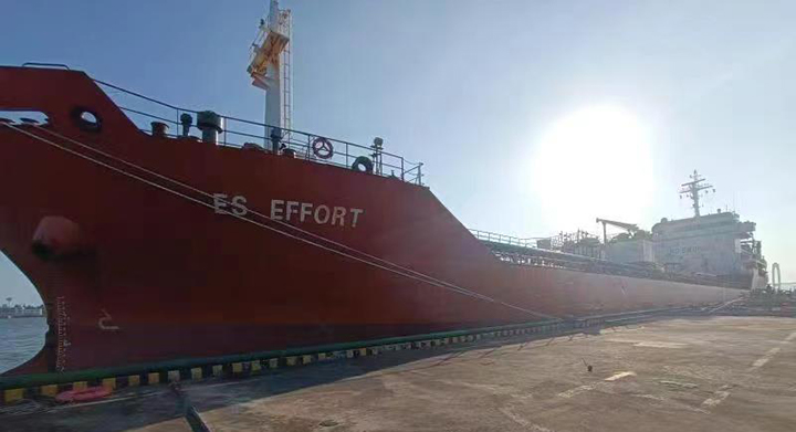 5月28日下午18時(shí)10分,裝載有2500噸基礎(chǔ)油的“永海奮進(jìn)”號外輪在碼頭操作人員的精準(zhǔn)引領(lǐng)下順利靠泊中油王港公司碼頭1號泊位,這是三年多來靠泊的首艘外貿(mào)船舶。