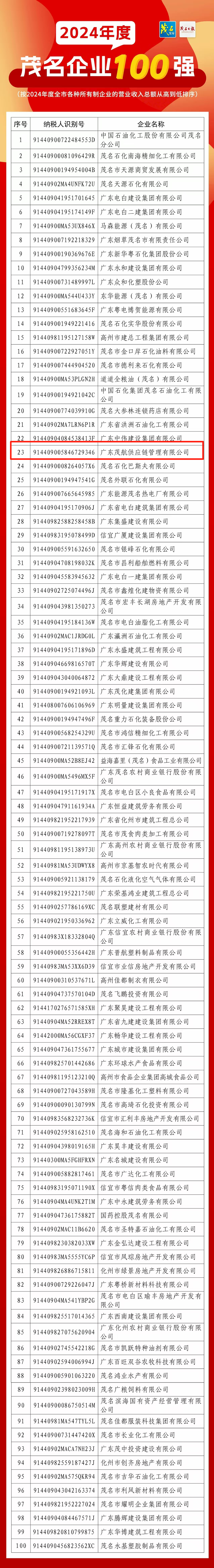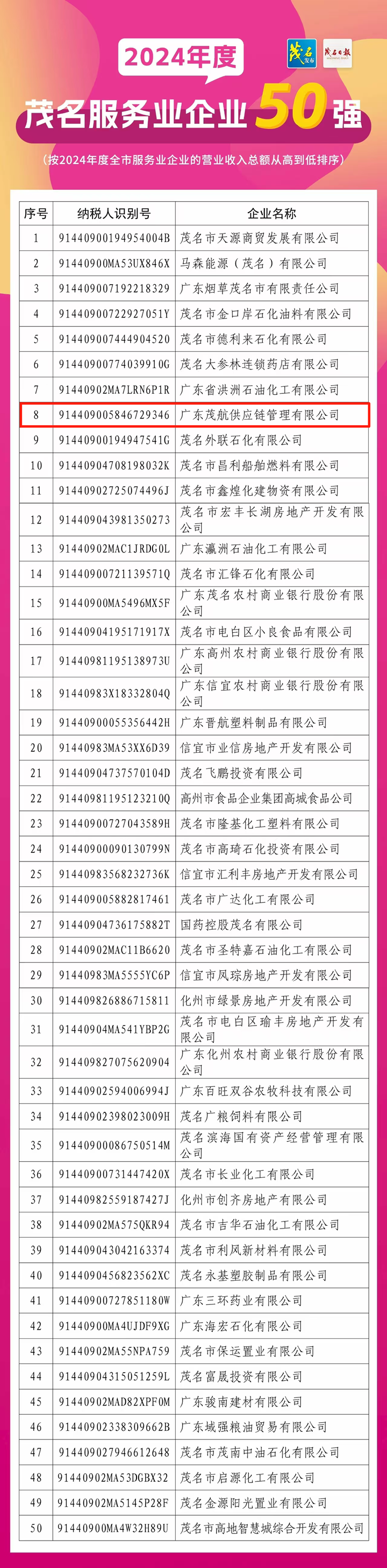 集團(tuán)下屬茂航供應(yīng)鏈公司榮登2024年度茂名企業(yè)百強(qiáng)榜單并躋身服務(wù)業(yè)前八