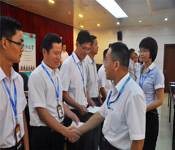 在會(huì)上,茂名港集團(tuán)全體干部職工觀看了公司兩部宣傳片,形象地了解了公司的定位和發(fā)展方向。接著會(huì)上對(duì)評(píng)選出來(lái)的第一季度“建言獻(xiàn)策”9名優(yōu)秀提案獲得者和14名“進(jìn)步之星”獲得者進(jìn)行了表彰和頒獎(jiǎng),勉勵(lì)他們?cè)俳釉賲枺瑸楣景l(fā)展貢獻(xiàn)更多智慧與力量,也為廣大職工樹立起榜樣!敖ㄑ垣I(xiàn)策”獲獎(jiǎng)?wù)叽韽埲髋c“進(jìn)步之星”獲獎(jiǎng)?wù)叽硇旖ê影l(fā)表了熱情洋溢、感人肺腑的獲獎(jiǎng)感言,他們都為在茂名港集團(tuán)這個(gè)氛圍和諧融洽、充滿激情與斗志的集體工作而感到驕傲,表示要繼續(xù)盡心盡力做好自己的本職工作,為茂名港集團(tuán)發(fā)展壯大而努力。胡軍董事長(zhǎng)在會(huì)上對(duì)獲獎(jiǎng)?wù)弑硎玖俗YR,他在會(huì)上和大家分享了茂名港集團(tuán)企業(yè)文化的構(gòu)建過(guò)程、核心文化、企業(yè)精神、品牌口號(hào)等內(nèi)容,并希望每一位職工都深入領(lǐng)會(huì)茂名港企業(yè)文化,同時(shí)他指出茂名港集團(tuán)能在短短不到兩年的時(shí)間內(nèi)取得令人矚目的成績(jī),歸根結(jié)底是在集團(tuán)優(yōu)秀的企業(yè)文化引領(lǐng)下,全集團(tuán)員工團(tuán)結(jié)拼搏、開拓進(jìn)取的結(jié)果。他希望通過(guò)這次企業(yè)文化活動(dòng)的開展,進(jìn)一步凝聚每一位職工的智慧,全體茂名港人團(tuán)結(jié)一致,擰成一股繩,推動(dòng)公司不斷向前進(jìn),為提升茂名港共同品牌價(jià)值而努力奮斗。